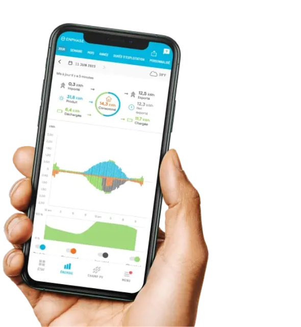 Avec l’application Enphase Enlighten surveillez l’état de votre système depuis n’importe où et sachez exactement combien d’énergie il produit. Vous pouvez générer des rapports sur la production d’énergie par jour, par semaine, par mois ou par année. Complet avec des graphiques et des infographies nets et faciles à lire.